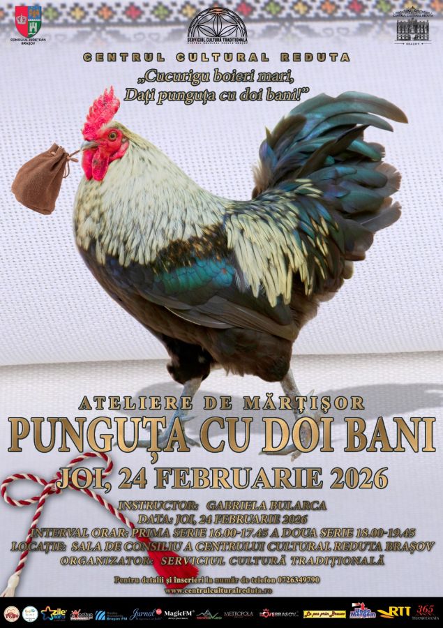 Pentru promovarea meșteșugurilor tradiționale, Centrul Cultural Reduta, prin Serviciul Cultură Tradițională, organizează un atelier de mărțișoare intitulat “Punguța cu doi bani”.
