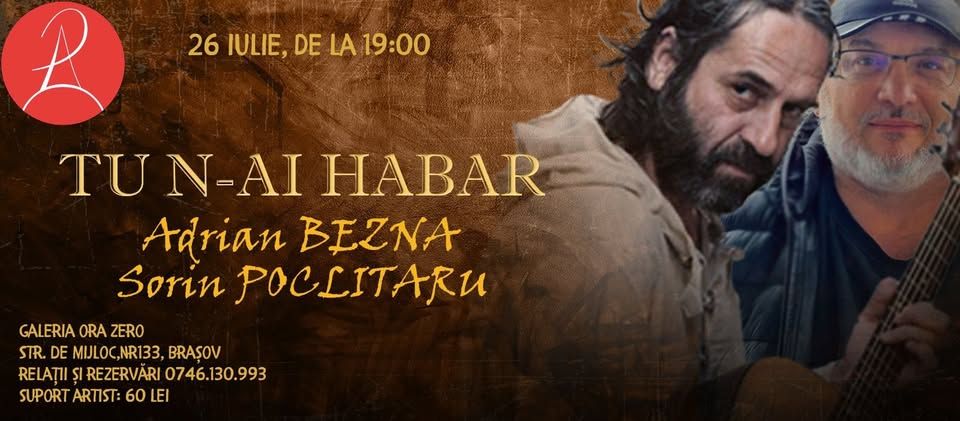 O seară specială cu doi artiști care știu să atingă sufletul publicului. Adrian Bezna, cu folk autentic și profund, și Sorin Poclitaru, cu poezie care te face să zâmbești, să simți și să gândești, vin la Brașov cu spectacolul „Tu N-ai Habar” – un amestec savuros de muzică, vers, emoție și umor fin.
