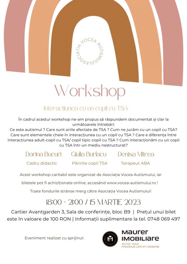 Acest workshop caritabil este organizat de Asociația Vocea Autismului cu susținerea @maurer.imobiliare , iar biletele pot fi achiziționate online în limita locurilor disponibile, accesând www.vocea-autismului.ro