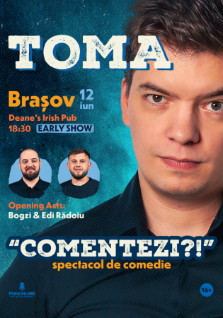 Credeai că dacă lași comentarii aiurea nu le citește nimeni? Ei bine, te înșeli, amice! Toma are timp și nimic de pierdut. Nu doar că le citește, dar îți și răspunde. Și ca să nu se distreze singur, în „Comentezi!?” îți prezintă un Best Of. Practic, show-ul lui Toma e un fel de The Empire Strikes Back, doar că în scris și fără probleme respiratorii. În deschidere avem doi indivizi amuzanți, Edy și Bogzi. Vă veți da seama după show care lasă comentarii pe net și care stalker-ește din umbră ca un om decenet.