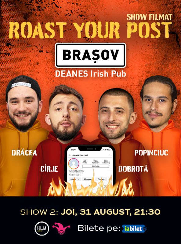 SHOW NOU în orașul tău. 4 băieți în apropierea ta sunt aici să-ți arate ce greșești în activitatea din social media și să-ți ia la ROAST profilul de Instagram. Te anunțăm că va fi un show filmat, deci cumpărând bilet la acest eveniment sunt șanse mari să apari pe Youtube, ai grijă.