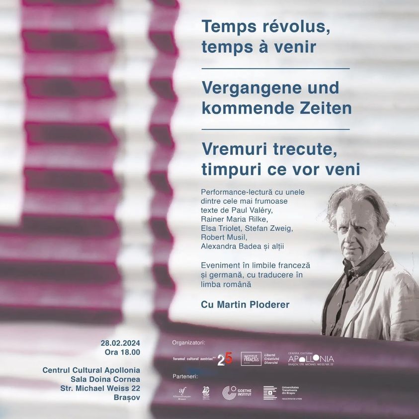 În data de 28 februarie, la ora 18.00, în Sala Doina Cornea a Centrului Cultural Apollonia, vă invităm să luați parte la turneul de lecturi performative în limbile franceză și germană „Vremuri trecute, timpuri ce vor veni”, în interpretarea actorului austriac Martin Ploderer. Evenimentul marchează într-un mod original începutul Lunii Francofoniei, împlinirea a 25 de ani de la înființarea Forumului Cultural București și centenarul Institutului Francez din România, printr-o călătorie comparativă în universul literar francez și austriac, în lumina ultimelor trei secole de istorie.