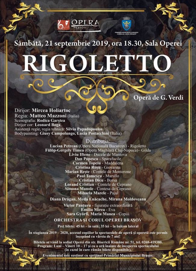 Sâmbătă, 21 septembrie 2019, de la ora 18.30, în Sala Operei, Opera Brașov programează una dintre cele mai recente premiere ale sale, „Rigoletto” de Giuseppe Verdi, care, în actuala montare, a văzut luminile rampei cu prilejul Festivalului Internațional de Operă, Operetă și Balet de anul trecut.