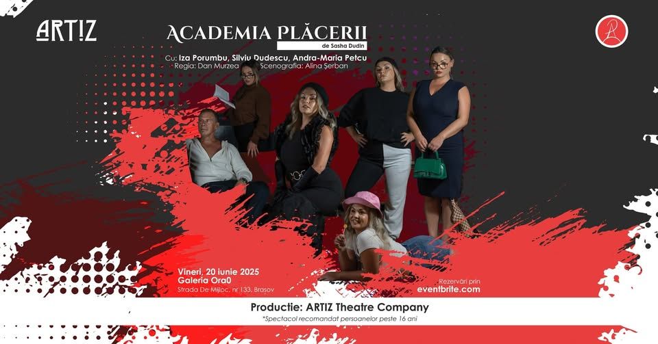 Vă invităm la Academia Plăcerii, de Sasha Dudin, un spectacol inspirat din serialul american “Hung”. Piesa de teatru are în comun cu serialul povestea unei escorte masculine, Alex, de peste 40 de ani, care are întâlniri la Hotelul Intim cu 5 femei puternice.