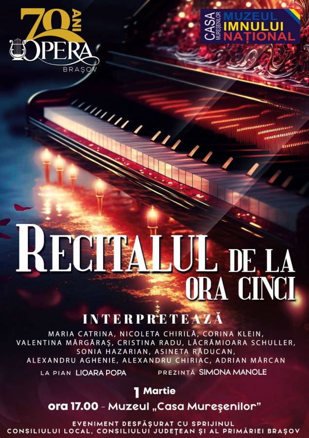 Miercuri, 1 martie 2023, de la ora 17.00, la Muzeul „Casa Mureșenilor”, vă invităm la „Recitalul de la ora cinci”, o ediție specială de Mărțișor. La eveniment participă soliștii Operei Brașov: Maria Catrina - soprană, Nicoleta Chirilă - soprană, Corina Klein - soprană, Valentina Mărgăraș - soprană, Cristina Radu - soprană, Lăcrămioara Schuller - soprană, Sonia Hazarian - mezzosoprană, Asineta Răducan - mezzosoprană, Alexandru Aghenie - bariton, Alexandru Chiriac - bariton, Adrian Mărcan – bariton. La pian îi va acompania Lioara Popa. Prezintă: Simona Manole.