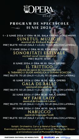 Biletele pentru repetiția generală cu public se pun în vânzare de joi, 16 mai 2024, ora 10.00, atât online, pe site-ul www.bilet.ro, cât și la sediul Operei Brașov din str. Bisericii Române nr. 51. Program Casierie: Luni – Vineri 10 – 17 şi cu o oră înainte de începerea spectacolelor (în cazul în care rămân bilete disponibile).