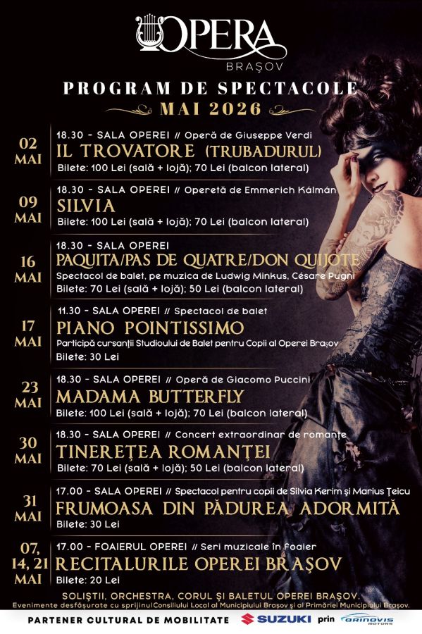 Biletele pentru evenimentele lunii mai 2026 se pun în vânzare de joi, 16 aprilie 2026, ora 10.00, atât online, pe site-ul www.bilet.ro, cât și la sediul Operei Brașov din str. Bisericii Române nr. 51.