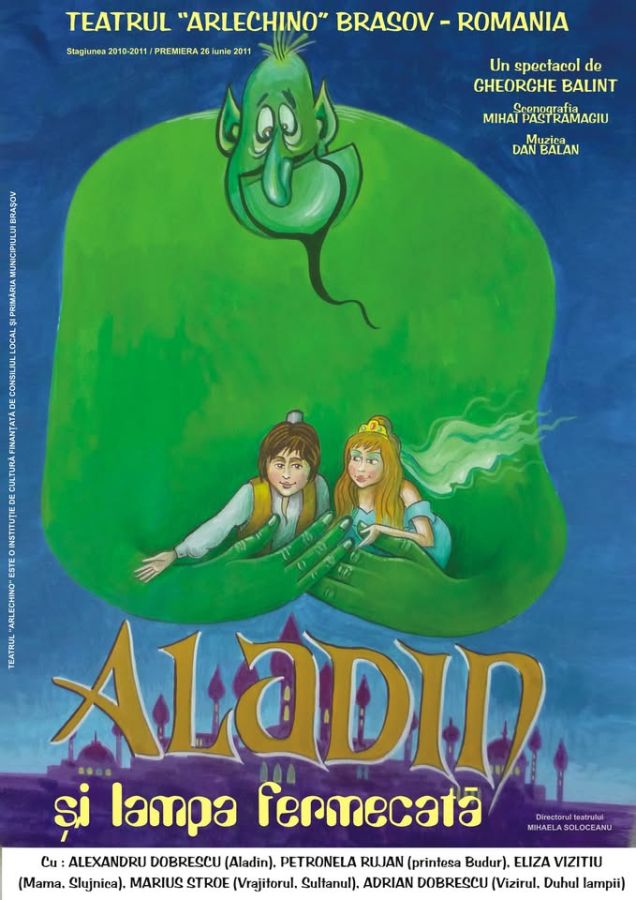 Celebra poveste este pusă în scenă într-o manieră ce îmbină tradiţia cu modernismul. Aladin şi lampa fermecată, una dintre frumoasele basme ale copilăriei este un spectacol colorat, cu păpuşi fascinante, în care jocul de lumini, muzica, decorul şi costumele ne duc cu gândul la acea lume misterioasă, fascinantă a orientului mijlociu. Aladin şi lampa lui cea fermecată sunt elementele cheie ale acestui spectacol inedit, pe marginea lor construindu-se şi celelalte personaje care dau o notă umoristică: duhul, sultanul, vrăjitorul, vizirul, slujnica. Şi cum nu există poveste nemuritoare fără final fericit, iar dragostea învinge întotdeauna în poveşti, întâlnim şi o frumoasă prinţesă care reuşeşte să îi fure inima lui Aladin, prinţesa Budur.