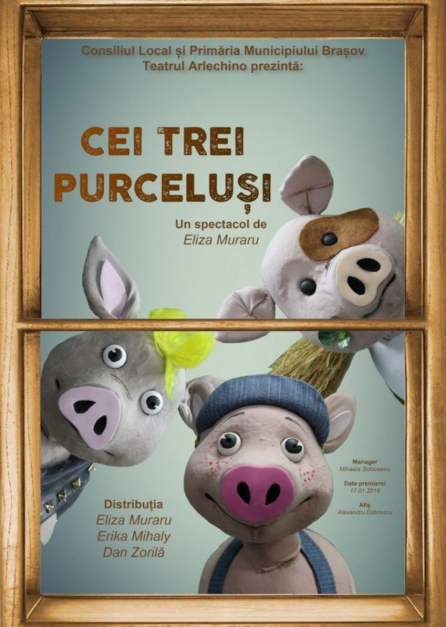 SINOPSIS: Spectacolul urmărește firul narativ al poveștii clasice a celor trei purceluși, care decid într-o zi să își construiască, fiecare, câte o căsuță. Din păcate, lupul cel rău are alte planuri pentru ei, încercând să distrugă căsuțele acestora și să îi mănânce pe cei trei. Însă, așa cum se întâmplă în fiecare poveste, și în acest caz binele va învinge, iar cei trei purceluși reușesc să pună capăt tiraniei lupului și să scape de acesta.