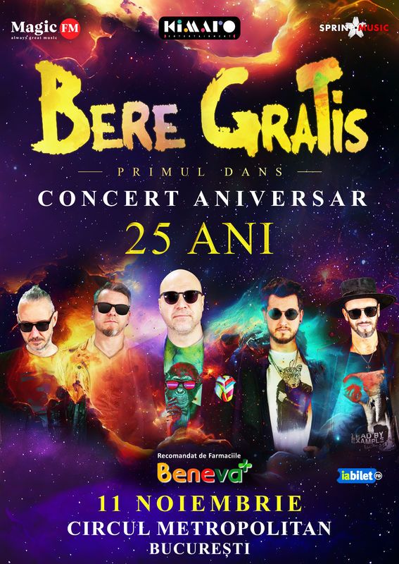 Bere Gratis, una dintre cele mai iubite formații de pop-rock din România, va celebra in acest an 25 de ani de carieră printr-un mega-concert, desfășurat la Circul Metropolitan București. Pe 11 noiembrie, Mihai Georgescu și Bere Gratis ți-au pregătit un eveniment special, care va aduce pe aceeași scenă toate artele. Practic, trupa care vā bucura sufletele de un sfert de secol a realizat un concept inedit, de la care nu ai voie să lipsești. Concertul aniversar Bere Gratis se va bucura de o serie de duete speciale, cu invitați unul și unul, și evident, cu hiturile mai vechi sau mai noi ale trupei, pe care le asculți de fiecare dată cu aceeași bucurie. Concertul aniversar Bere Gratis – 25 de ani va însemna, înainte de toate, un show total, la care orice fan al trupei își dorește să asiste!