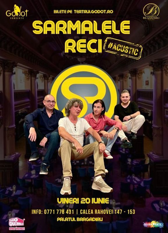 Un concert special, cum rar fac Sarmalele Reci. Un concert acustic, în formulă extinsă, cu vioară, violoncel, voci adiacente. Hiturile Sarmalele Reci vor răsuna la Palatul Bragadiu altfel, cu un sunet mai blând, pentru suflet.