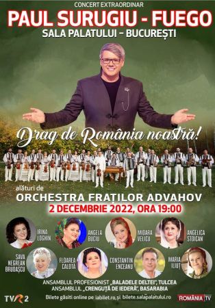 Artistul complex și iubit de toți români, cel care are o carieră de 30 de ani, cu succese multiple, fiind și moderator tv, actor, om de radio, pictor, editorialist, mai nou lansând și o carte, Paul Surugiu-Fuego, invită românii la evenimentul anului, concertul extraordinar ”Drag de România noastră!”, care va avea loc pe data de 2 decembrie 2022, la Sala Palatului din București, începând cu ora 19.00.
