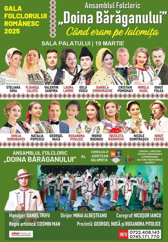 Cu o distributie de exceptie in care regasim mari nume ale folclorului romanesc impreuna cu solistii Ansamblului „Doina Baraganului” si corpul de balet condus de Nicusor Iancu, acompaniati de catre orchestra „Doina Baraganului” dirijata de Mihai Albesteanu sub conducerea managerului Daniel Trifu, aniversam intreaga activitate precum si folclorul romanesc.