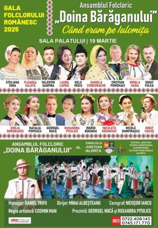 Pe 11 martie portile Salii Palatului din Bucuresti devin neincapatoare pentru un spectacol sarbatoare o adevarata Gala a Folclorului Romanesc in care celebram peste 60 ani de traditie ai Ansamblului „Doina Baraganului” din Ialomita.