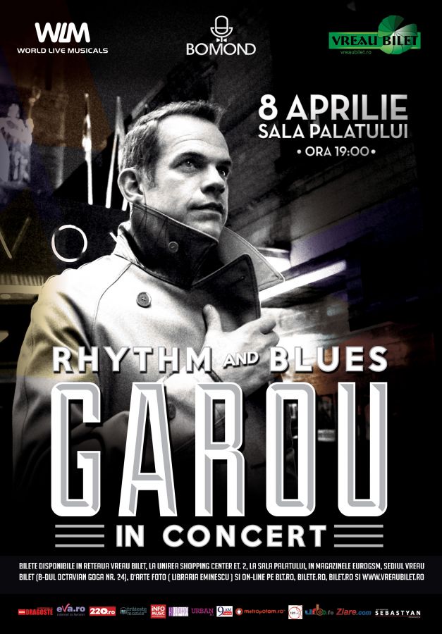GAROU, considerat ani la randul cel mai iubit cantaret canadian, cu vanzari record de albume, 3 discuri de platina si spectacole live grandioase sustinute cu casa inchisa, vine pentru prima data in Romania la Sala Palatului, pe 8 aprilie, la invitatia www.vreaubilet.ro, cu un concert-eveniment bilingv: “Rhythm and Blues”. GAROU va aduce la Sala Palatului unul din concertele cu care a cucerit milioane de spectatori in intreaga lume, “Rhythm and Blues”, care celebreaza spiritul muzicii R&B si care contine cover-uri dupa piese celebre cantate in engleza si in franceza, intr-o interpretare plina de personalitate si virtuozitate alaturi de o trupa de muzicieni de marca.