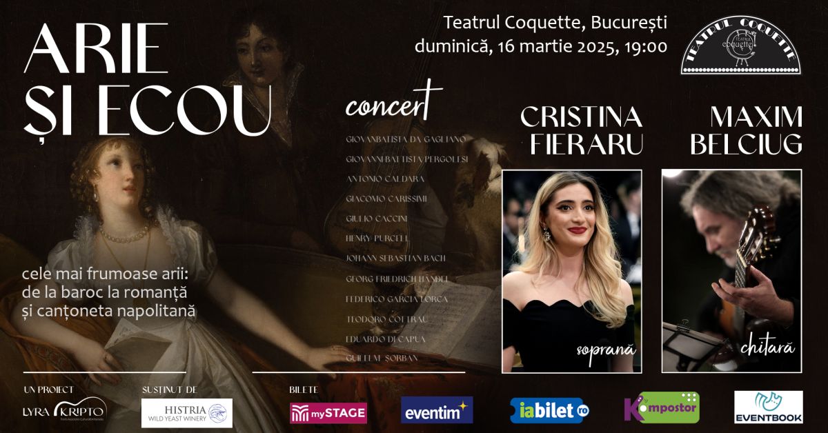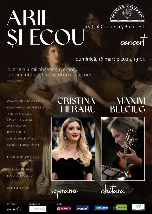 De anul trecut, soprana Cristina Fieraru și chitaristul Maxim Belciug au inițiat seria de concerte ARIE ȘI ECOU prin care își propun să ofere publicului prilejul unor întâlniri cu frumusețea și diversitatea repertoriului liric într-o prezentare adaptată la o scenă de teatru mic, unde intimitatea dintre artiști și public și lipsa artificiilor de regie permit o altfel de apropiere – mai directă, mai sinceră, mai vie – de această muzică nepieritoare.