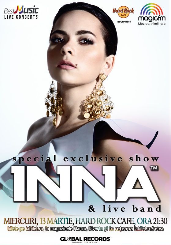 Solista ce si-a castigat renumele de ambasador muzical al Romaniei in lumea intreaga, INNA, concerteaza alaturi de trupa sa live la Hard Rock Cafe, miercuri, pe 11 martie, de la ora 21:30.
