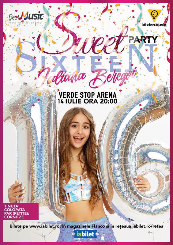 Iuliana Beregoi te invita sa te distrezi impreuna cu ea la cel mai mare party din toate timpurile: Sweet Sixteen. Pe 14 iulie, de ziua Iulianei, la Arenele Romane, vei petrece o zi de neuitat, vei canta si vei dansa alaturi de Iuliana si invitatii ei speciali, vei avea parte de multe surprize si vei simti ca faci parte din Generatia Z, cea mai fresh si cea mai cool generatie. Iuliana implineste 16 ani doar o data. Nu rata acest eveniment unic! Imbraca-te colorat, fa-ti cornite din par (daca esti fata) si vino la cel mai tare party marca Mixton Music, Sweet Sixteen! Primele 200 de bilete sunt la oferta de pret pe iabilet.ro. Acestea se pun in vanzare pe 6 februarie la ora 19:00