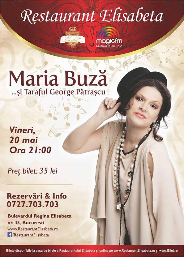 O astfel de serata va avea loc si in data de 20 mai, la Restaurant Elisabeta, lasandu-va incantati de glasul inconfundabil si de carisma inegalabila a Mariei Buza, acompaniata de instrumentistii talentati din taraful George Patrascu.