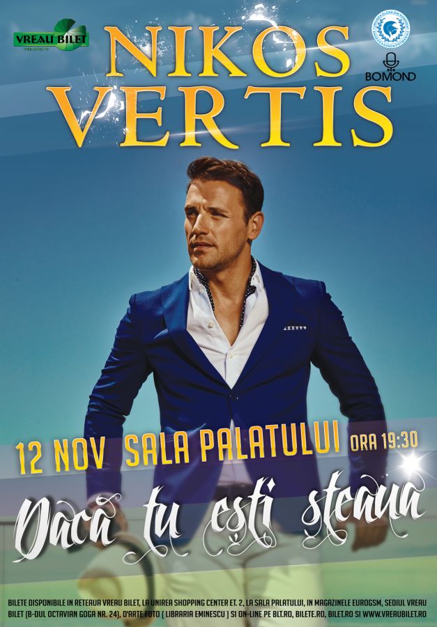 Nikos Vertis, unul dintre cei mai râvniți burlaci ai Greciei, va face furori cu cea mai mare petrecere bouzoukia din Romania pe care o va susține pe 12 noiembrie la Sala Palatului. Artistul răsplătit cu mai multe discuri de platina pentru compozițiile sale, va susține pe 12 noiembrie, la Sala Palatului, primul mare concert de muzica greceasca din Romania, la invitația Vreau Bilet.