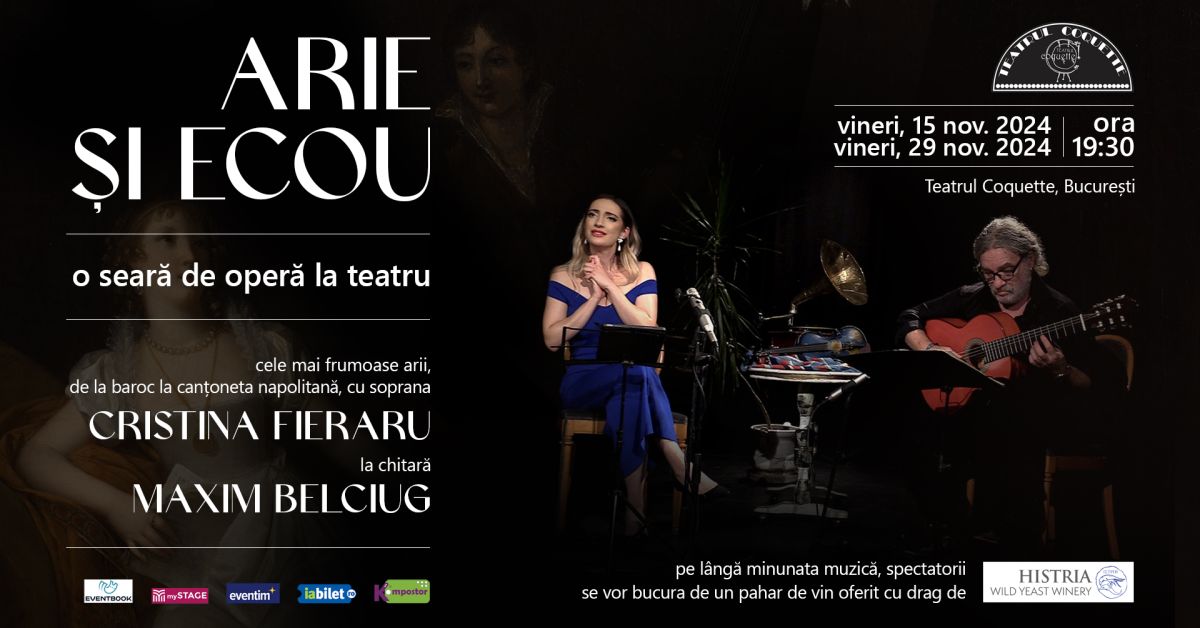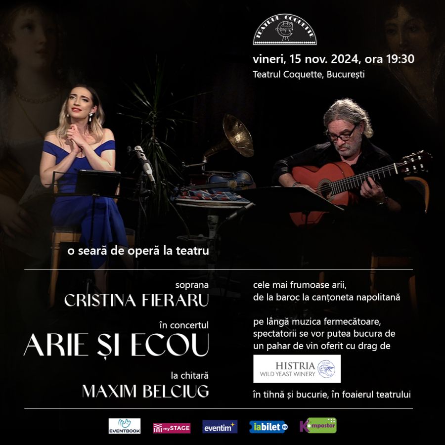 Vineri, 15 noiembrie, la Teatrul Coquette din București are loc o nouă reprezentație a concertului ARIE ȘI ECOU, susținut de soprana Cristina Fieraru, acompaniată la chitară de Maxim Belciug. Programul propune o selecție de arii și cântece adaptate la prezentarea în spațiul intim și elegant al teatrului, de la baroc la canțoneta napolitană, într-un spectacol ce oferă publicului unele dintre cele mai frumoase partituri ale repertoriului liric, de la lamento-ul Didonei din opera Dido and Æneas de Henry Purcell, madrigalul Amarilli, mia bella de Giulio Caccini, sau minunatele Ombra mai fù, din opera Serse, și Lascia ch'io pianga, din opera Rinaldo, de Georg Friedrich Händel, dar și piese celebre, precum Santa Lucia sau ’O sole mio. Cu alte cuvinte, o seară de operă la teatru, o sărbătoare muzicală cu volute spectaculoase, atmosferă barocă, rafinată, și muzică prețioasă. După concert, publicul se va putea bucura, în tihnă, în foaierul teatrului, de un pahar de vin oferit cu drag de CRAMA HISTRIA.