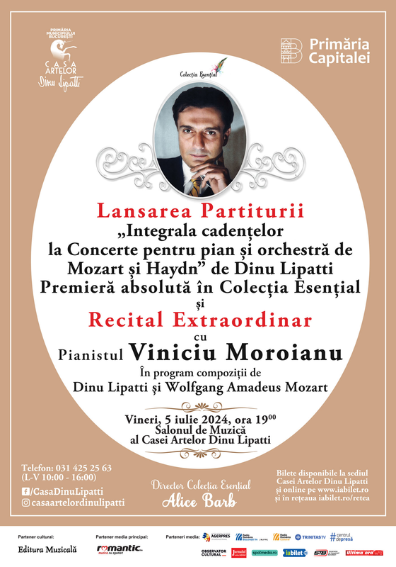 Casa Artelor Dinu Lipatti invită publicul iubitor de Artă și Cultură, vineri, 5 iulie 2024, începând cu ora 19:00, la Lansarea Partiturii „Integrala cadențelor la Concerte pentru pian și orchestră de Mozart și Haydn de Dinu Lipatti” și la Recitalul Extraordinar, susținut de Pianistul Viniciu Moroianu, care va purta spectatorii într-o fascinantă călătorie muzicală.