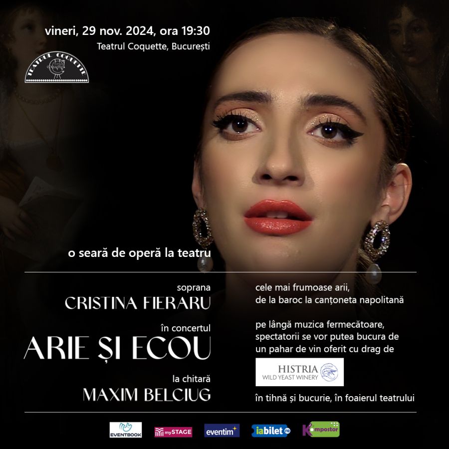 Seria de concerte ARIE ȘI ECOU, inițiată de soprana Cristina Fieraru și chitaristul Maxim Belciug, va fi programată în mod constant la Teatrul Coquette în stagiunea 2024-2025, în încercarea de a oferi publicului prilejul unor întâlniri cu câteva dintre cele mai frumoase creații ale repertoriului liric într-o prezentare adaptată la o scenă de teatru mic, unde intimitatea dintre artiști și public și lipsa artificiilor de regie permit o altfel de apropiere – mai directă, mai sinceră, mai vie – de această muzică de o infinită frumusețe și bogăție de nuanțe.