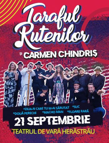 De departe unul dintre cele mai bine primte grupuri muzicale din România, Taraful Rutenilor și Carmen Chindriș vă invită în 21 septembrie, la Teatrul de Vară Herestrău la un concert ce va celebra sfârșitul verii și începutul oficial al toamnei. Melodii precum „Ziua-n care tu mai sărutat”, „Suc”, „Două perechi” sau „Floare Rară” vor face ca atmosfera teatrului din Herestrău să fie incendiară.