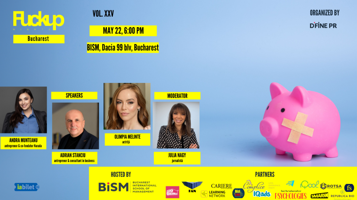 „Suntem generații care au privit eșecul cu teamă, cu rușine, cu rezistență. Îl percepeam ca pe o pierdere radicală și iremediabilă. Odată cu evoluția societății, am învățat că eșecul nu este despre a renunța și a-ți fi teamă să încerci din nou, ci despre a-l privi și trata dintr-o perspectivă diferită, constructivă – ca pe o platformă valoroasă de evoluție. Eșecul este despre a-ți da voie să crești cu fiecare experiență. Invitații noștri, cu parcursuri profesionale unice și din zone complementare, vor împărtăși momentele care le-au marcat cariera și care i-au echipat mai competent pentru următoarele experiențe. Ne bucurăm de parteneriatul cu BISM, unde ne simțim ca acasă, pentru că am urmat cursurile lor, suntem aproape de cei mai buni lideri în industrie și împărtășim aceeași misiune și aceleași valori”, spune Diana Iosu, fondator DiFine PR și organizator Fuckup Nights Bucharest.