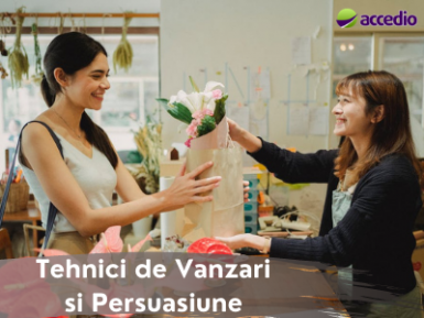 La finalul cursului vei putea să foloseşti persuasiv elemente de comunicare para-verbală şi non-verbală, pentru a obține vanzarile dorite. Mai mult decât un curs online de vanzari. Interacțiunea și stilul unui trainer cu experiență de 20 de ani în vanzari corporate zi de zi, atât B2C (business to client) cât și B2B (business to business), nu poate fi înlocuită doar de calculator. Cu Accedio, oamenii tăi de la vanzari vor stăpâni abilitatea, strategia și procesele necesare atingerii obiectivelor organizației.