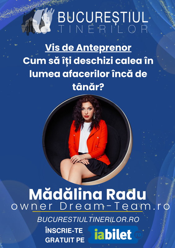 În cadrul acestui eveniment o tânără anteprenor în vârstă de 24 de ani, Mădălina Radu creatorul Hub-ului Educațional Dream Team, și al seriei de evenimente Bucharest Bussines Ladies ne va prezenta experiența și know-how-ul dobândit în cei 8 ani de experiență în afaceri și freelanceing.