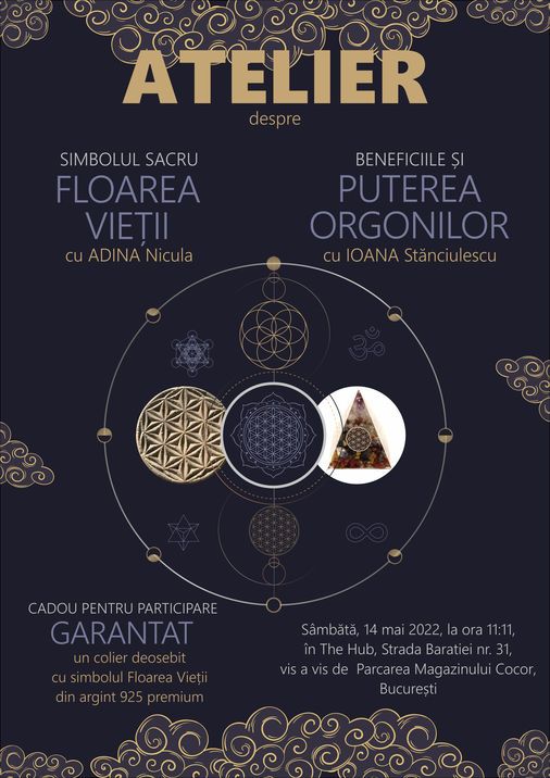 Vino pe 14 mai 2022 la ora 11 și 11 minute la Atelier educativ despre Floarea Vietii, Mandala Personală și Orgoni. Organizăm în locația The Hub din București, o sesiune de lucru educativă, în care vom decripta figurile de geometrie sacră și vom cunoaște beneficiile și puterea orgonilor!