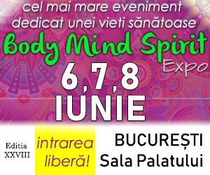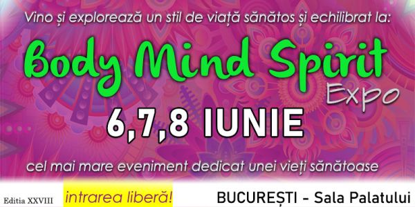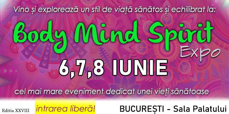 Vino pe 6, 7 și 8 iunie la Sala Palatului, la Body Mind Spirit Expo și descoperă produse naturiste, alimente bio, terapii alternative și învață de la cei mai buni specialiști în nutriție, dezvoltare personală și spiritualitate.