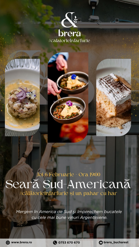 Se spune că cine a ajuns în America de Sud s-a întors cu două lucruri: dor de gustul local și poftă de vinul bun de acolo. Noi ne ocupăm de ambele. Pe 6 februarie, de la ora 7 PM, la Brera, te așteaptă o cină inspirată de pasiunea și intensitatea continentului sud-american, unde fiecare farfurie spune o poveste.