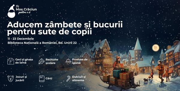 Jocuri și jucării, rechizite, cărți, dulciuri și alimente neperisabile, geci și ghete de iarnă și produse igienice. Locația campaniei: Biblioteca Națională, Bd. Unirii nr. 22.