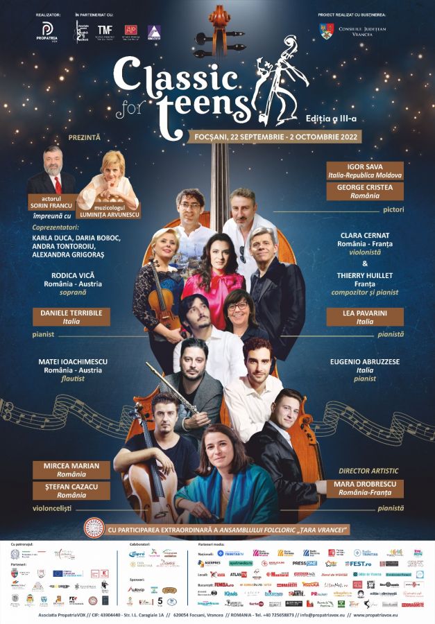 Festivalul “Classic for Teens” revine între 22 septembrie şi 2 octombrie 2022 la Focşani, cu a treia ediţie, director artistic fiind în acest an Mara Dobrescu, pianistă de origine română stabilită în Franța. Principalele instituţii culturale ale municipiului Focşani, Ateneul Popular Maior Gheorghe Pastia şi Teatrul Municipal Maior Gheorghe Pastia, dar şi alte spaţii emblematice din oraş, vor găzdui evenimentele acestui proiect dedicat tinerilor interpreţi de muzică clasică, realizat cu susținerea Consiliului Județean Vrancea, festival pe care organizatorii l-au propus orașului natal începând din 2020, după douăzeci de ani de intensă activitate culturală în Italia.