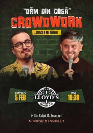 Miercuri, 5 februarie, de la ora 19:30, la Lloyd's Comedy Pub te așteptăm să te distrezi împreună cu noi la un Show de crowdwork cu Mincu şi Rădoiu, numit `DĂM DIN CASĂ`