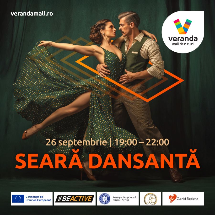 La Veranda Mall, Săptămâna Europeană a Sportului se sărbătorește cu un eveniment plin de farmec - Seară Dansantă, cu participarea Cvartetului Passione și a Federației Române de Dans Sportiv. Pe 26 septembrie, mergi în Amfiteatrul Veranda Mall să te bucuri de o atmosferă vibrantă, cu muzică live și demonstrații de dans spectaculoase.