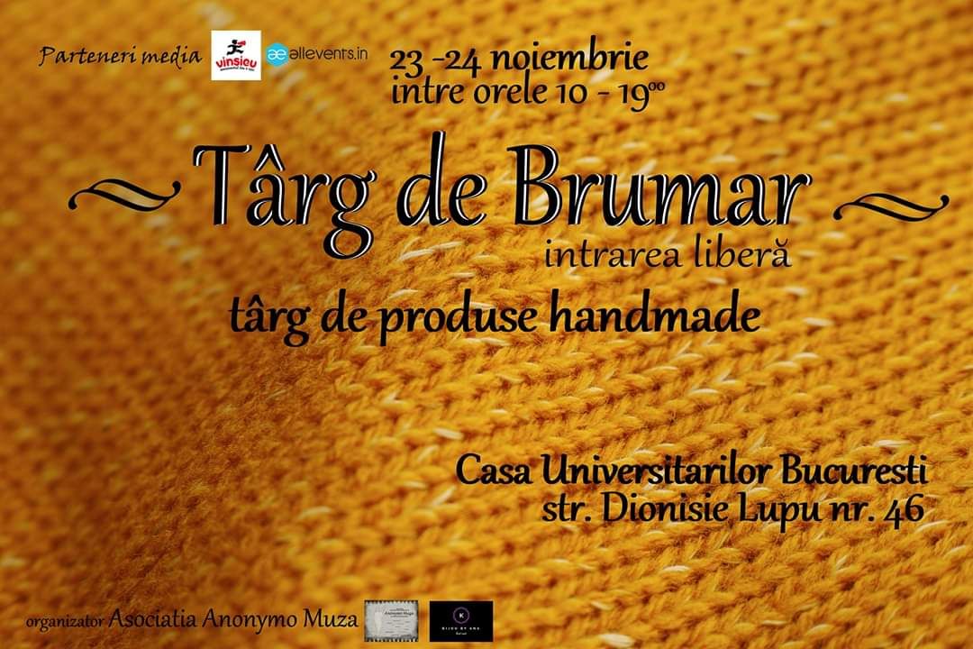 Asociatia Anonymo Muza te invita la targul sfarsitului de toamna intre 23 - 24 noiembrie, orele 10,00-19,00, la Casa Universitarilor București - Sala de Festivitati. Te asteptam pentru a-ti reinnoi colectia de bijuterii, haine... crosetate sau cusute manual, pentru a-ti alege tabloul preferat, sau decoratiuni pentru casa. Tot aici vei gasi creme, lumanari parfumate si multe cadouri pentru cei dragi. Vizitatorii targului se vor putea inscrie la o tombola cu doua premii surpriza.