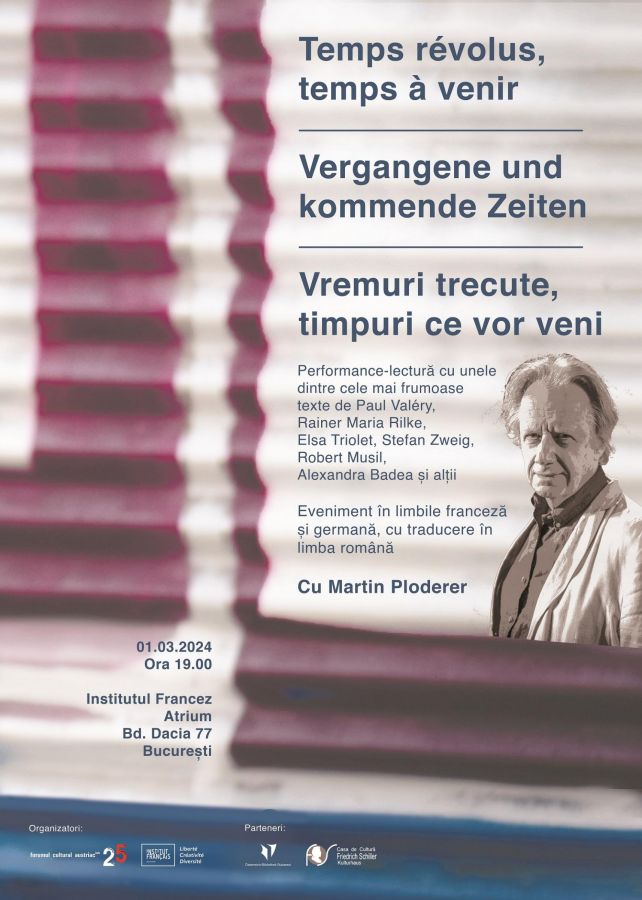 Caruselul timpurilor de ieri și de azi în texte de stringentă actualitate ale unor scriitori de renume din Austria si Franța - Paul Valéry, Rainer Maria Rilke, Elsa Triolet, Stefan Zweig, Ingeborg Bachmann, Robert Musil, Alexandra Badea și alții. În cadrul seriei de evenimente care celebrează cei 25 de ani de la înființarea Forumului Cultural Austriac București, precum și centenarul Institutului Francez din România, cele două instituții organizează împreună turneul „Vremuri trecute, timpuri ce vor veni” al actorului austriac Martin Ploderer. Acesta va fi protagonistul unor seri de lecturi performative în limbile franceză și germană care se vor desfășura la Iași (26 februarie), Brașov (28 februarie) și București (1 martie). Acest turneu marchează într-un mod original începutul Lunii Francofoniei în România, propunând un format de lectură în premieră pe țară, în care texte scrise în germană și franceză sunt prezentate de același actor, perfect bilingv. Lecturile beneficiază de traducere în limba română.