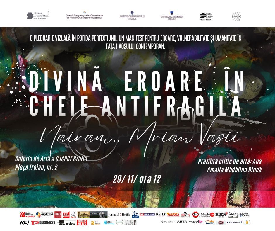 Sâmbătă, pe 29 noiembrie, începând cu ora 12:00 la Galeria de Artă a CJCPCT Brăila (Piața Traian, nr. 2), publicul brăilean este invitat la primul vernisaj personal ca membru stagiar al Uniunii Artiștilor Plastici – filiala Brăila al scenografului și artistului vizual Nairam Marian Văsii, prezentat de criticul de artă Ana Amalia Mădălina Dincă. Artistul aduce o colecție construită în trei ani, unde imperfecțiunea și eroarea devin limbaj artistic, catharsis și forță regenerativă, iar evenimentul este cu vânzare, fiecare lucrare fiind însoțită de certificat de autenticitate.
