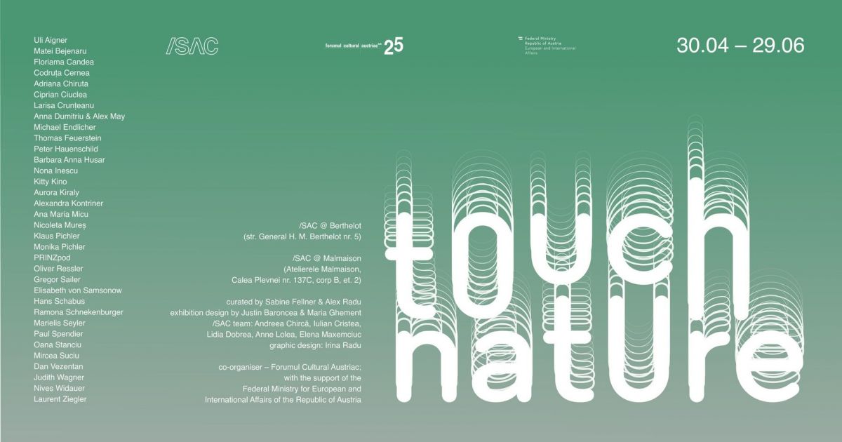 În data de 30 aprilie, între orele 18:00-19:30 la /SAC @ Berthelot (Str. General H. M. Berthelot nr. 5) și 19:30-21:00 la /SAC @ Malmaison (Atelierele Malmaison, et. 2, Calea Plevnei 137C), vă invităm la vernisajul expoziției „Touch Nature”, curatoriată de Sabine Fellner și Alex Radu, cu un design de expoziție de Justin Baroncea și Maria Ghement.
