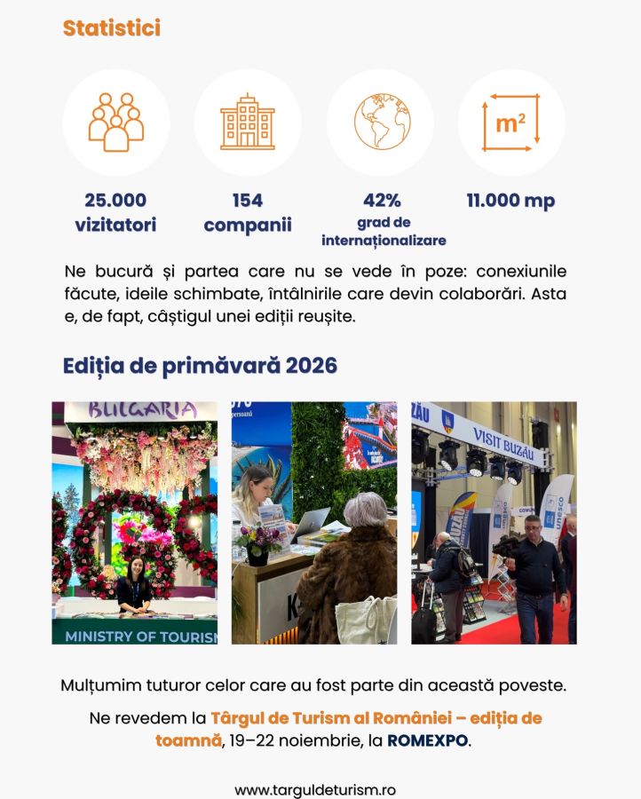 Pe parcursul celor patru zile, peste 25.000 de vizitatori au participat la eveniment, interesați de destinații, servicii turistice și direcțiile care vor influența sezonul 2026. Prezența constantă în zona expozițională, interacțiunea directă cu specialiștii din domeniu și interesul pentru conferințele de la scena de networking au confirmat relevanța evenimentului atât pentru publicul larg, cât și pentru profesioniști.