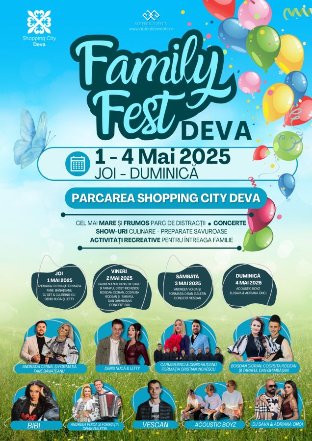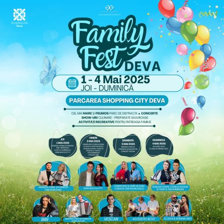 Family Fest Deva revine cu o ediție plină de culoare și zâmbete, în perioada 1 – 4 mai 2025, în parcarea Shopping City Deva – locul unde muzica, gustul și bucuria se întâlnesc sub același cer de mai.