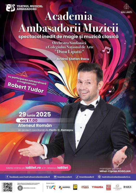 Magicianul Robert Tudor și Orchestra Colegiului Național de Arte „Dinu Lipatti” sunt protagoniștii spectacolului Academia Ambasadorii Muzicii, o producție a Teatrului Muzical Ambasadorii, care va avea loc duminică, 29 iunie, ora 17:00, la Ateneul Român.