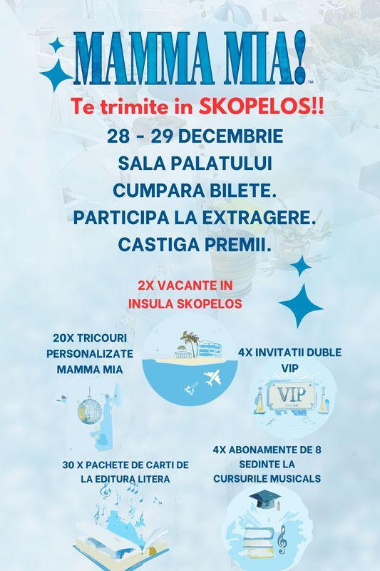 Visezi la o escapadă în Skopelos? Participă la spectacolele MAMMA MIA! pe 28 și 29 decembrie și intră automat în tragerea la sorți pentru: