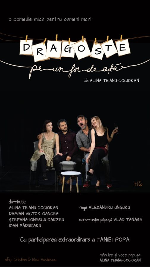 „Dragoste pe-un fir de ață”, o comedie mică pentru oameni mari, scrisă de Alina Teianu-Cocioran și regizată de Alexandru Unguru.
