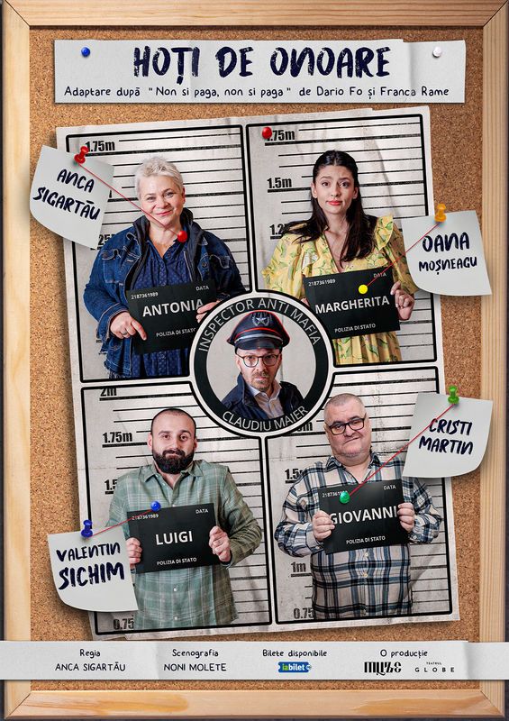 Adaptare după “Non si paga, Non si paga” de Dario Fo, comedia “Hoți de onoare” propune publicului o distribuție de excepție: Anca Sigartău, Damian Victor Oancea/Cristi Martin, Oana Moșneagu/Mara Oprea, Vlad Gherman/Valentin Sichim și Claudiu Maier. Aflați deja la a patra colaborare în teatru și după succesul extraordinar al celor două seriale TV, Adela si Lia, în care au jucat împreună, cei 5 actori ne promit o comedie extraordinară și garanteaza 2 ore de bună dispoziție.