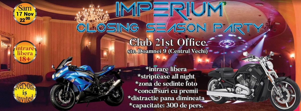 Dupa ce am facut 28 de iesiri in acest sezon si mii de km impreuna cu peste 300 de motociclisti din toata tara, a venit momentul sa bagam motoarele la iernat si sa dam un party memorabil de inchidere de sezon. Distractia nu se termina in sezonul rece, continuam cu iesiri bilunare la munte, caritabile si party-uri in Bucuresti.