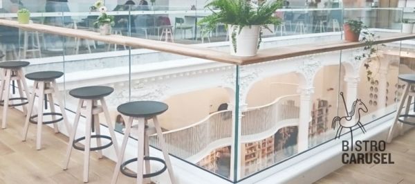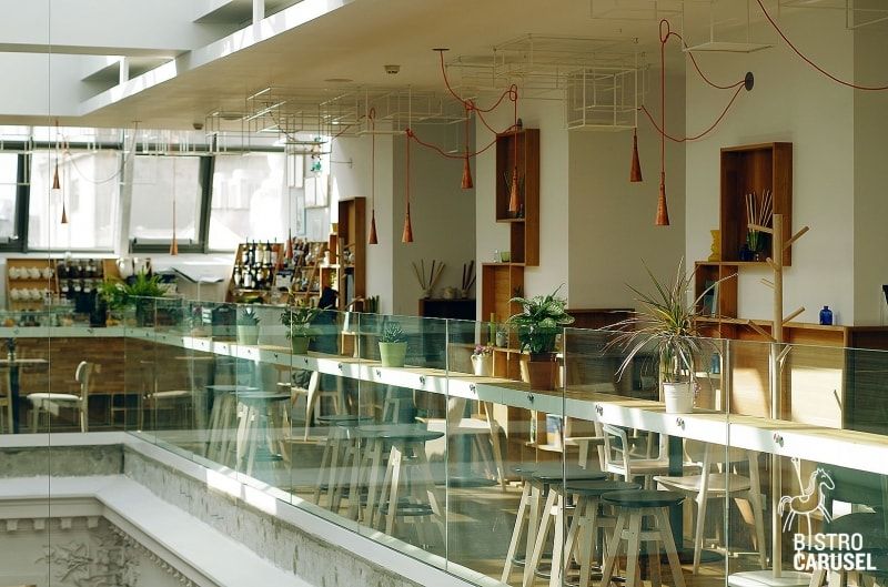 Bistro Carusel, aflat la ultimul nivel al Caruselului Cărturești, oferă și cele mai bune locuri pentru a admira cea mai frumoasă librărie din România- și una dintre cele mai reușite amenajări comerciale din lume.